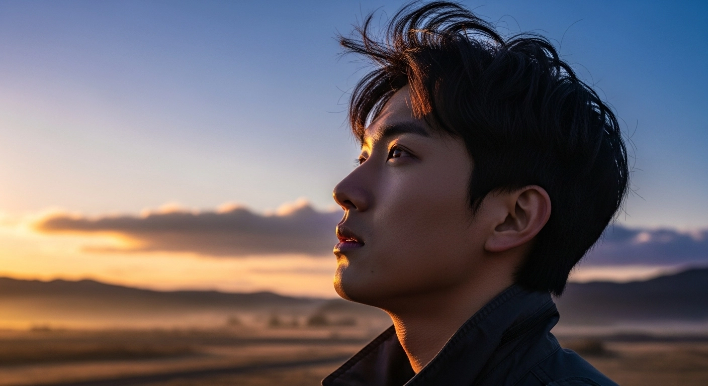 새벽의 빛을 받으며 하늘을 바라보는 사람, 시작의 느낌 이미지