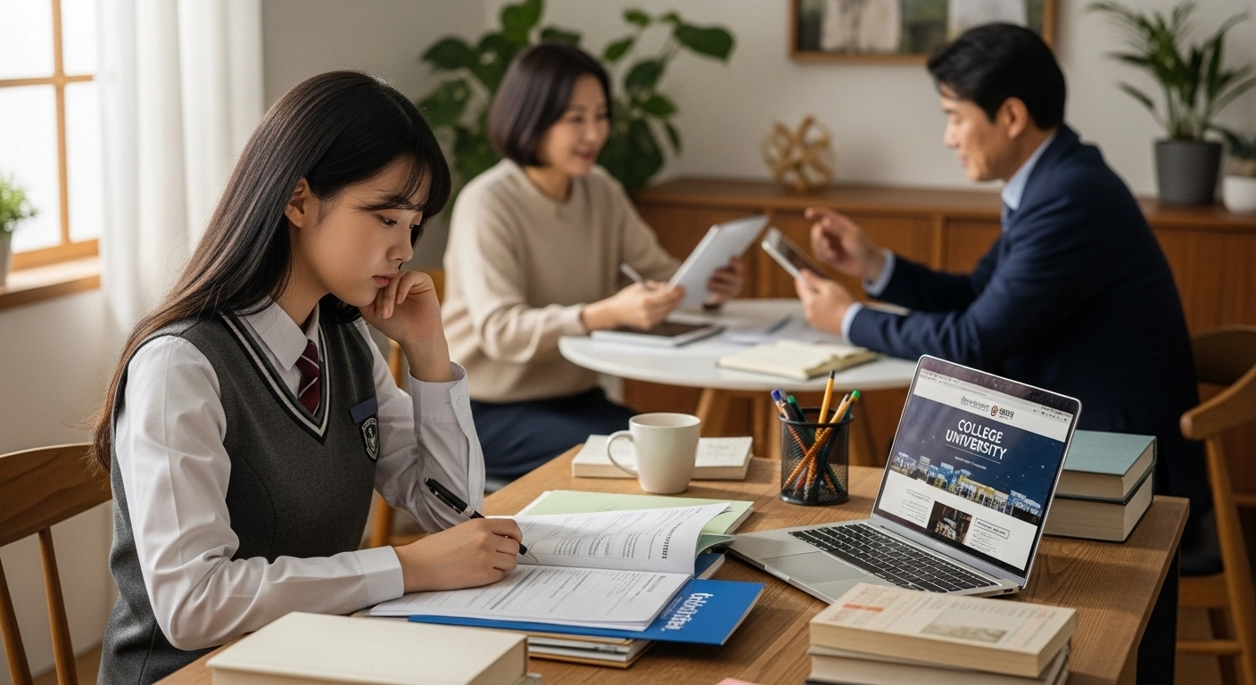 고등학생이 대학 수시 지원 자료를 보며 고민하고 있는 장면