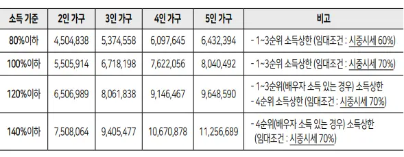 * 소득·자산 요건 : 도시근로자 가구원수별 가구당 월평균소득의 70% 이하(배우자 소득 있는 경우 90% 이하), 총자산가액 36,100만 원 이하(부동산가액 + 자동차가액 + 금융자산가액 + 일반자산가액 - 부채)