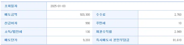 ✔️ 즉시 매도 시 본인 부담금 : 발행금액-(매도금액-수수료)-(선급이자-소득/법인세-주민세)로 계산하며, 대략적인 금액은 발행금액 1백만 원 Ⅹ 할인율(8.16172%)로 간단히 계산할 수 있습니다. (개인과세 기준임)