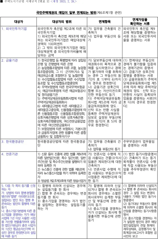 👉 국민주택채권의 매입이 일부 면제되는 범위【☞ 주택도시기금법 시행규칙 별표 1 ☜】