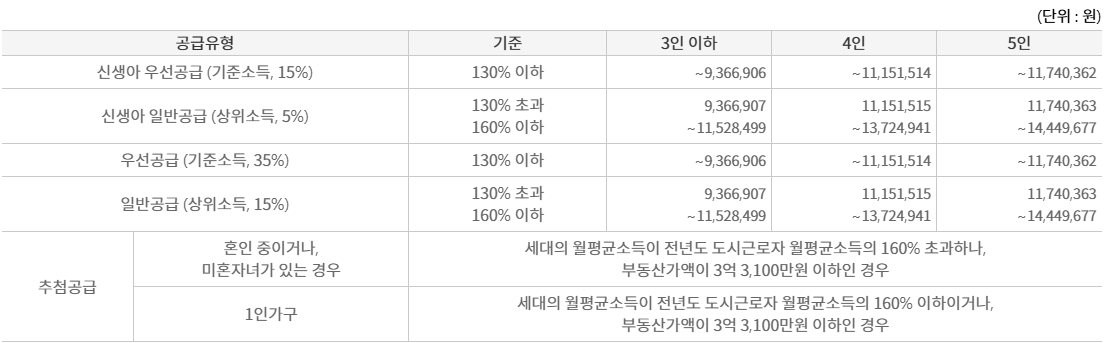 ➡️ 신생아 일반공급 : 부부 모두 소득이 있는 경우, 부부 중 1인의 소득이 전년도 도시근로자 가구당 월평균소득의 140%를 초과하지 않아야 합니다.