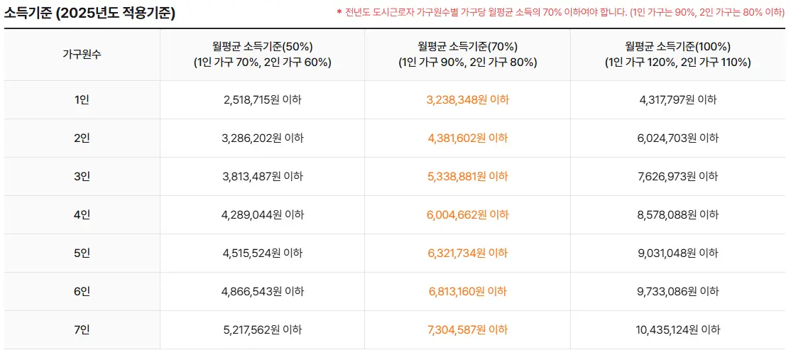 ✅ 입주자격 : 입주자모집공고일 현재 무주택세대구성원으로, 아래의 소득과 자산보유 기준을 충족하는 자, ① 소득 → 전년도 도시근로자 가구원 수별 가구당 월평균 소득의 70%(1인 가구 90%, 2인 가구 80%) 이하