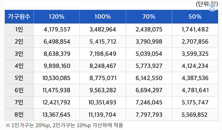 👉 가구원 수는 세대 구성원 전원(임신 중인 경우 태아 포함)을 말하며, 세전 금액으로 산정함