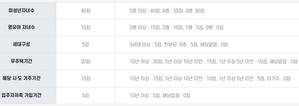 ② 다자녀 특별공급 당첨자 선정 → 아래 배점표(100점 만점)의 고득점순으로 선정하되, 동점 시 1) 미성년 자녀 수, 2) 신청자 나이(연월일 계산)순으로 선정합니다.