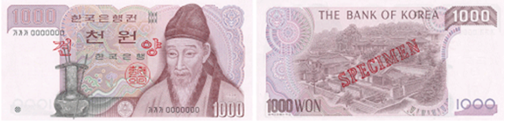 ✔️ 이 은행권은 1983년 은행권의 도안을 체계적으로 정비할 때 다른 은행권과 함께 도안이 일부 수정된 이후 위조방지장치가 추가되어 조금씩 모습을 바꾼 5,000원권과 10,000원권과는 달리 변함없는 모습으로 최장수 은행권의 자리를 지키고 있습니다.