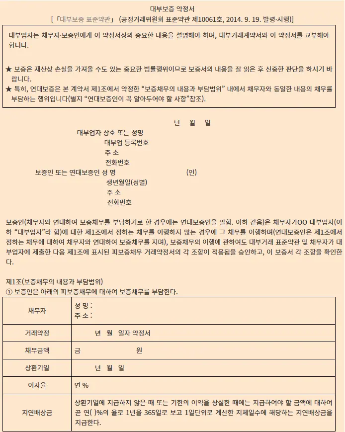 ✅ 대부보증계약서 : 대부보증 계약서는 공정거래위원회에서 제공하는 표준약관을 사용할 수 있습니다.【☞ 대부보증 표준약관 ☜】