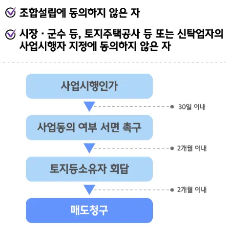 ✅ 매도청구 : 2개월이 지나면 사업시행자는 그 기간이 만료된 때부터 2개월 이내에 조합설립 또는 사업시행자 지정에 동의하지 않겠다는 뜻을 회답한 토지등소유자와 건축물 또는 토지만 소유한 자에게 건축물 또는 토지의 소유권과 그 밖의 권리를 매도할 것을 청구할 수 있습니다. (도시 및 주거환경정비법 제64조 제4항)