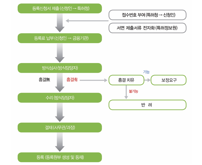 ➡️ 특허결정 ➡️ 설정등록료 납부 (3개월 이내) ➡️ 등록 완료 및 특허공보 게재 ➡️ 연차등록료 매년 납부 ➡️ 미납 시 보전명령 또는 권리소멸 ➡️ 등록보정제도 활용 가능